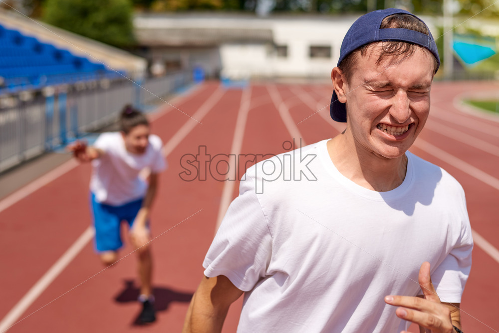 Young athlete man racing on running track with the opponent on background. Screaming and pushing to the limit