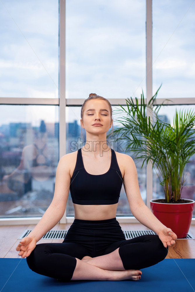 Young blonde woman in sportswear is meditating on a yoga mat with closed eyes. Bright room with greenery, panoramic windows
