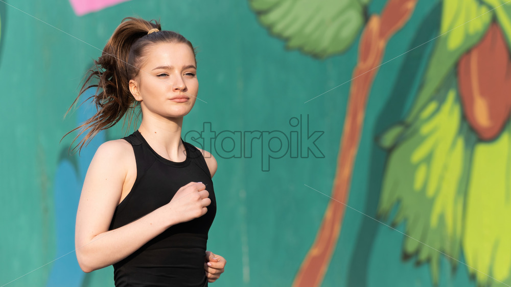 Young blonde woman in sportswear running on the road at outdoors training, multicolored wall on the background