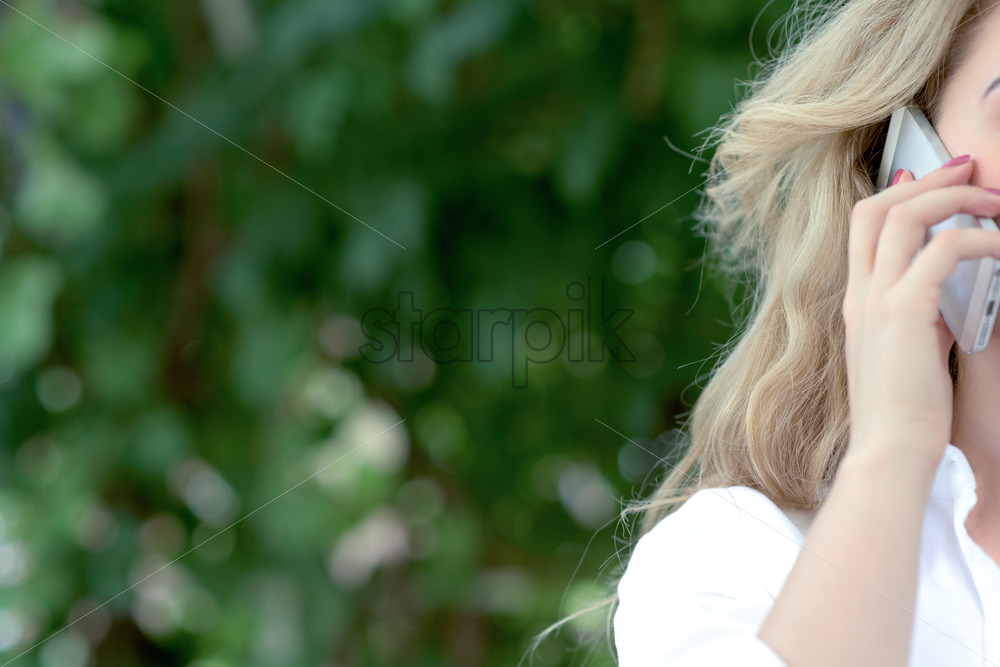 Home » Shop » people » Young blonde woman with pale rose nails talking on smartphone on green trees background. Close-up photo