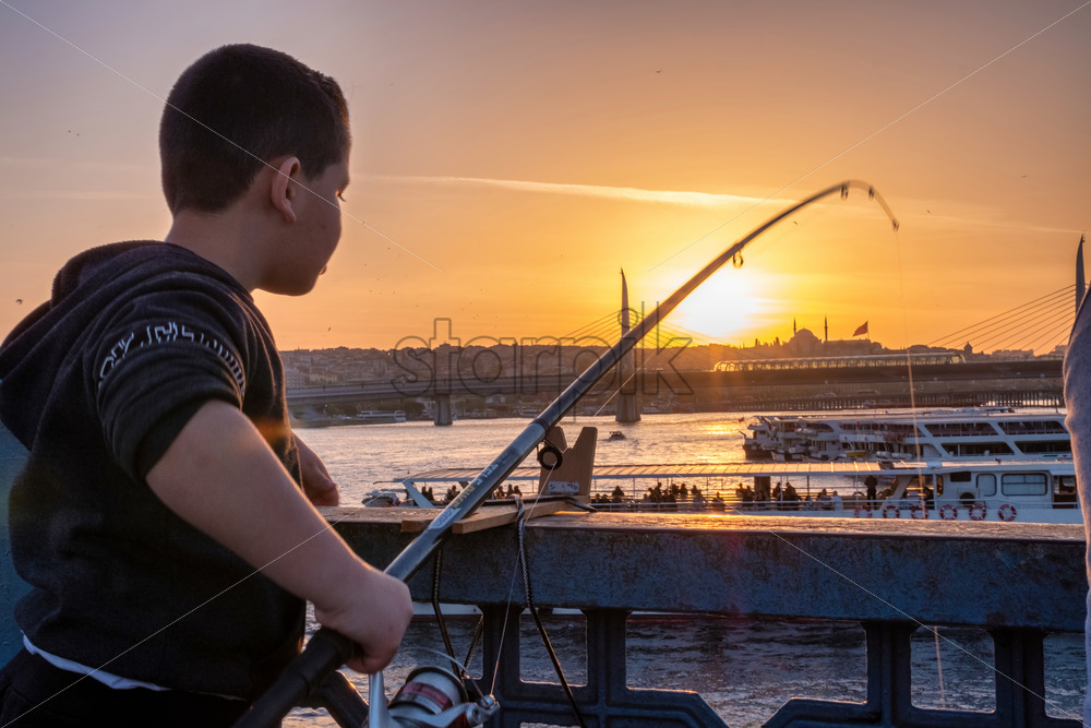 Home » Shop » photo » Young boy holding a fishing tackle in the foreground of the outstanding yellow sunset of the Turkish sea, flying seagulls and boats