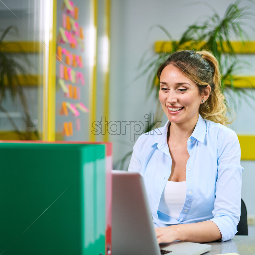 Young business woman working on the laptop computer in the office, smiling and being thoughtful. Workers and sticky notes on background
