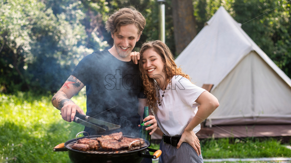 Young couple frying meat on the grill and drinking beer, laughing. Greenery around. Glamping
