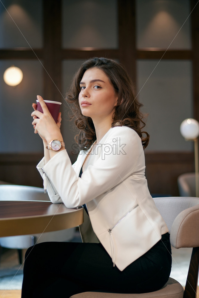 Young cute girl drinking coffee in a cafe. Looking to the camera Royalty Free Stock photo