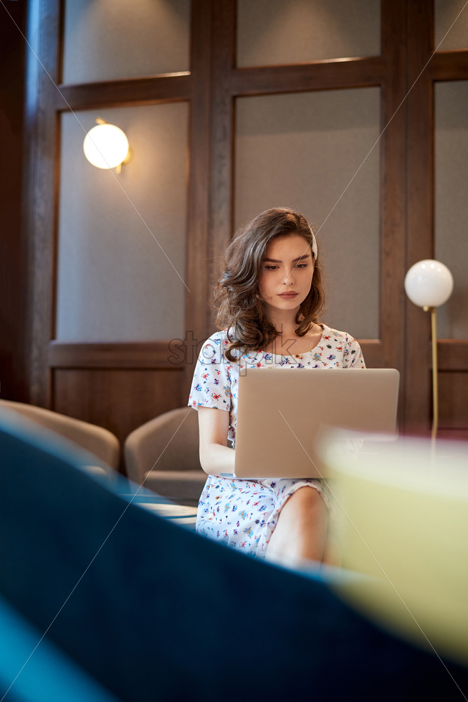 Young cute girl in dress working on a laptop in coffee shop. Sitting on couch. Loft interior Royalty Free Stock photo