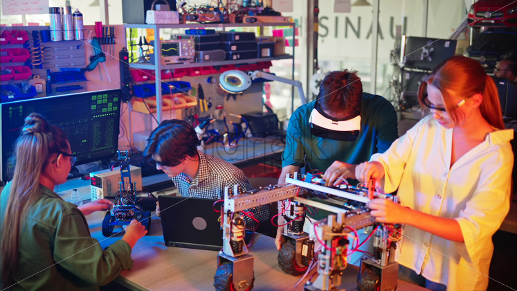Young engineers with VR virtual reality headset fixing a robotic car in research laboratory, slow motion Royalty Free Stock Video Footage