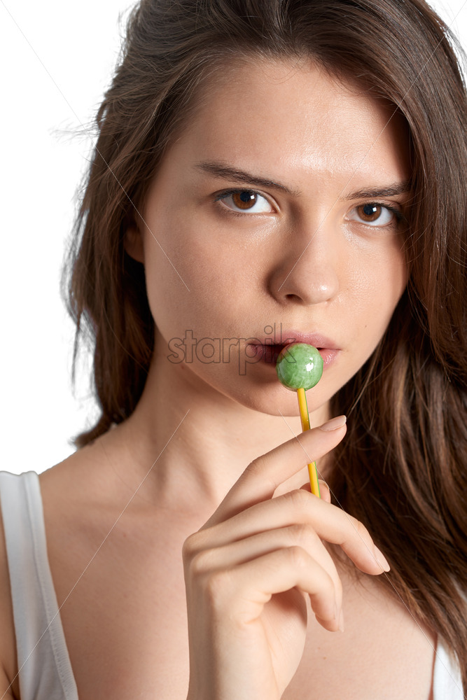 Home » Shop » photo » Young girl sucking lollipop and looking at the camera. Isolated background