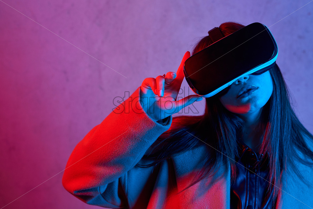 Young girl using virtual reality helmet while wearing a coat. Neon red and blue lights on concrete background. Place for text Royalty Free Stock photo