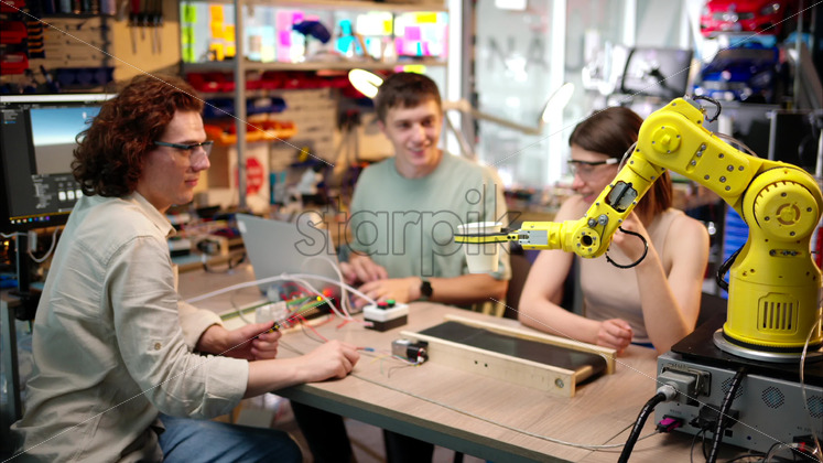 Home » Shop » people » Video – Young happy engineers programming an yellow robotic arm in the workshop to grab cardboard water glass, computer programming training for coffee preparation, celebrating success