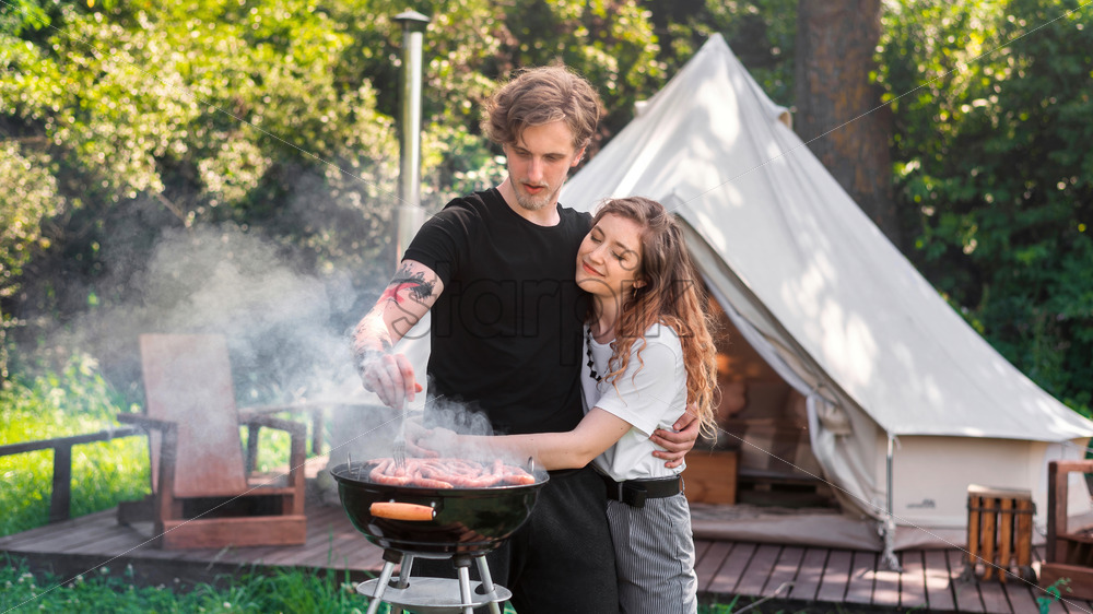 Young hugging couple frying meat on the grill. Greenery around. Glamping