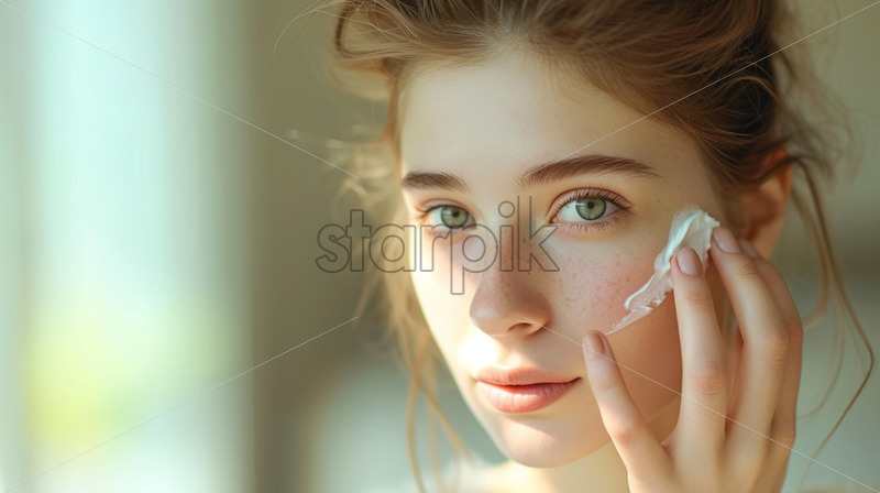 Young lady who spreads cream on her face.