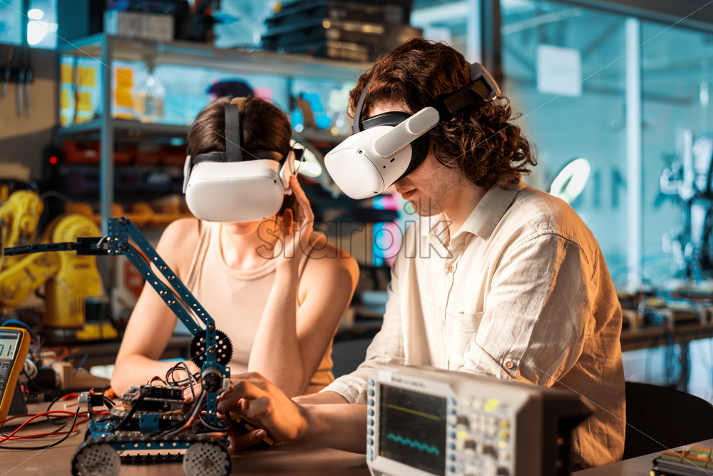 Young man and woman in VR glasses doing experiments in robotics in a laboratory. Robot and tools on the table
