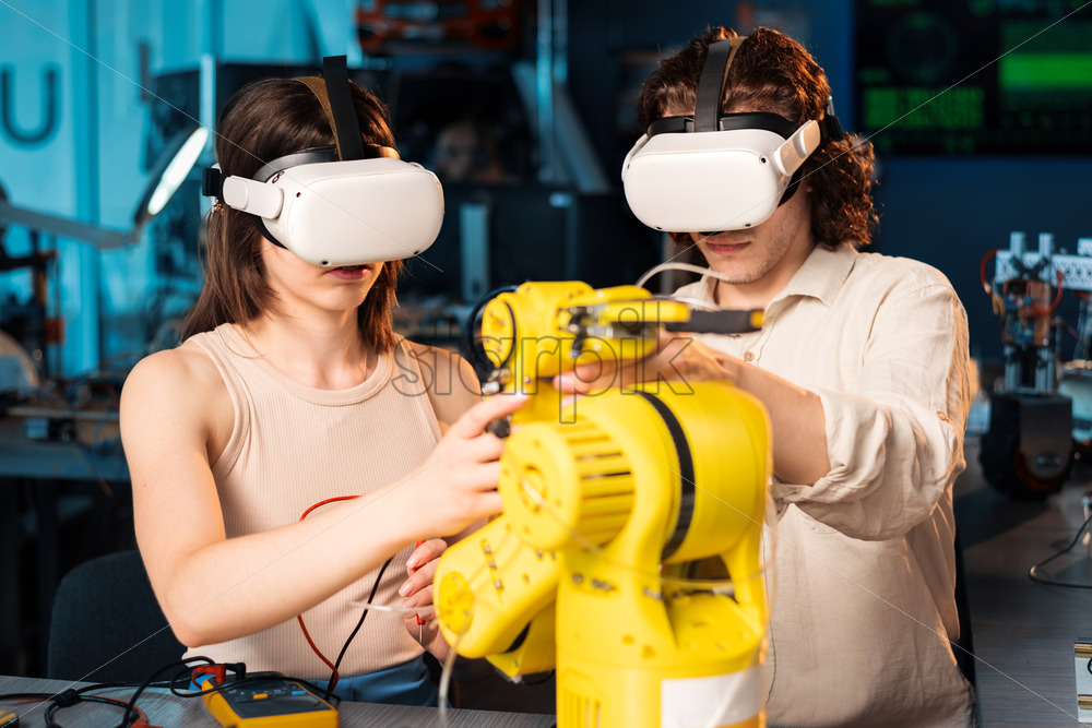 Young man and woman in VR glasses doing experiments in robotics in a laboratory. Robot on the table