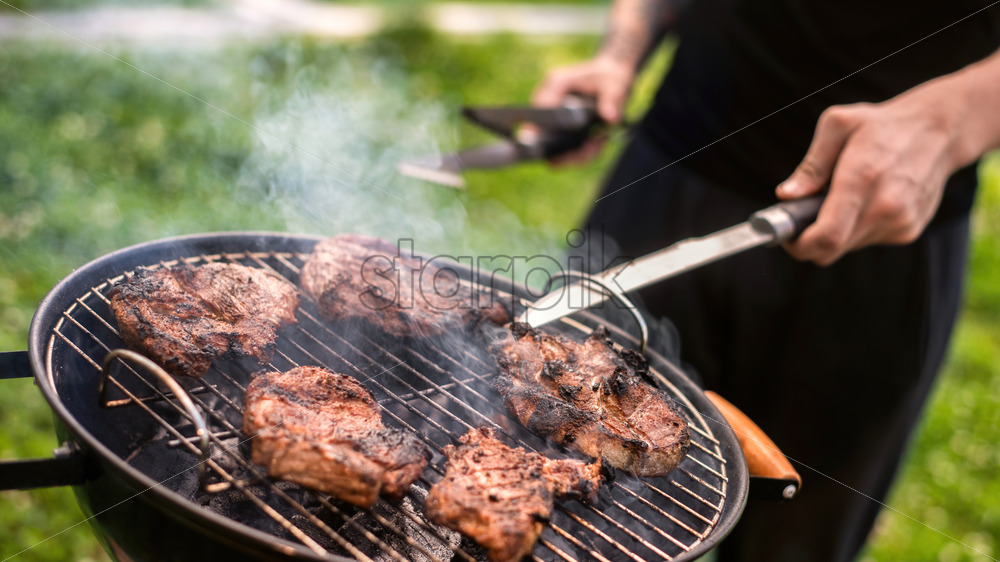 Young couple frying meat on the grill and drinking beer. Greenery around. Glamping
