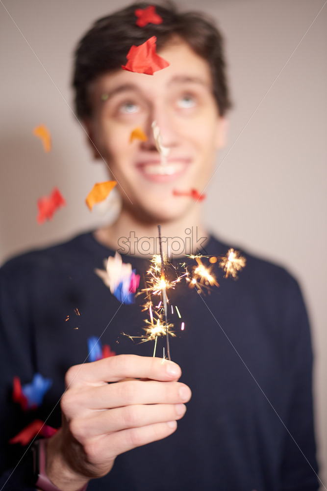Young man holding sparkler while dreaming about something. Looking up and smiling. Confetti flying. Christmas holiday idea Royalty Free Stock photo