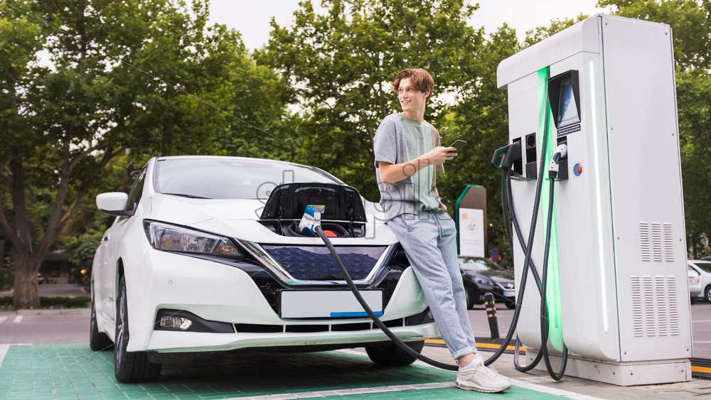 Home » Shop » photo » Young man with an electric car at charging station in Chisinau, Moldova