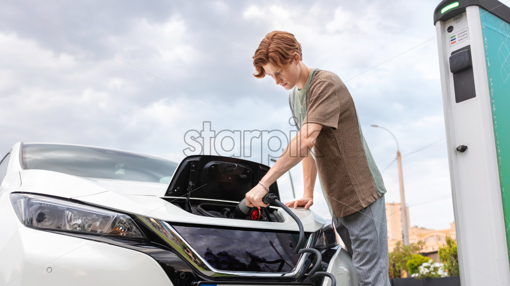 A young man at a car charging station inserting charger into an electric car in Chisinau, Moldova