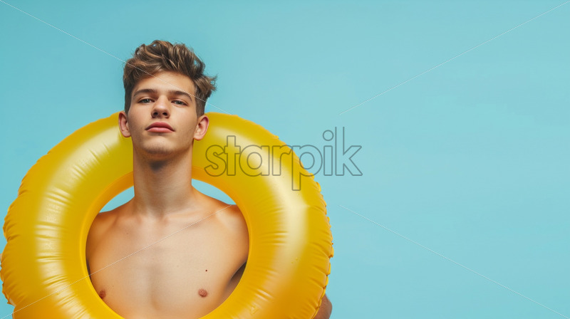 Woman wearing yellow swimming suit and a rounded yellow sunglasses