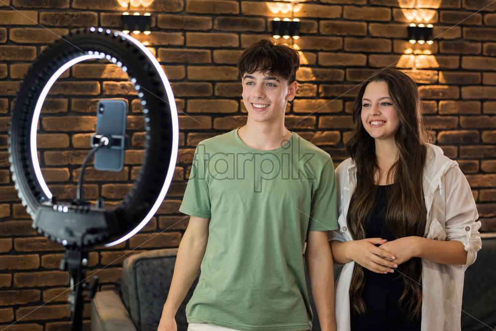 Young smiling man and woman blogger influencers posing and shooting themselves on smartphone on a tripod with ring light in a studio
