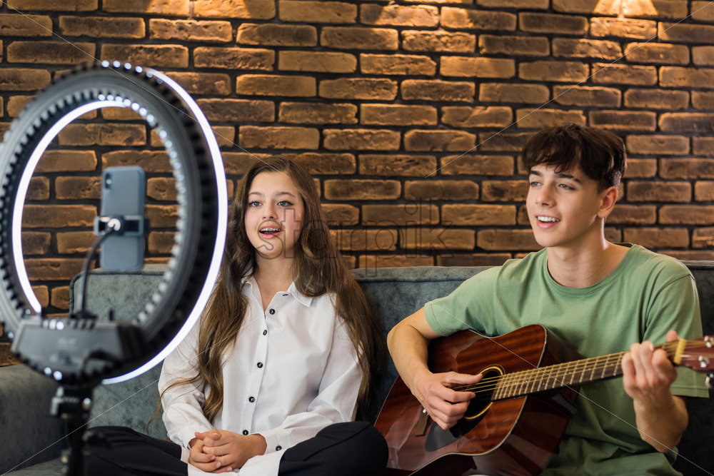 Young smiling man and woman playing on a guitar and singing, shooting themselves on smartphone on a tripod with ring light in a studio