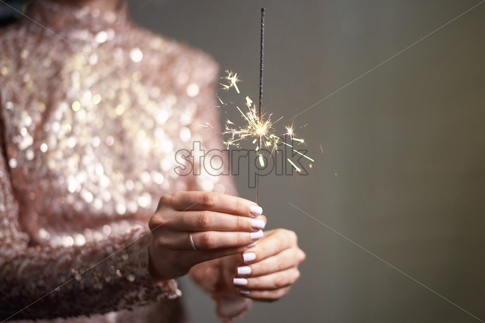 Young woman holding sparkler in hands. Wearing shiny dress. Christmas holiday idea Royalty Free Stock photo