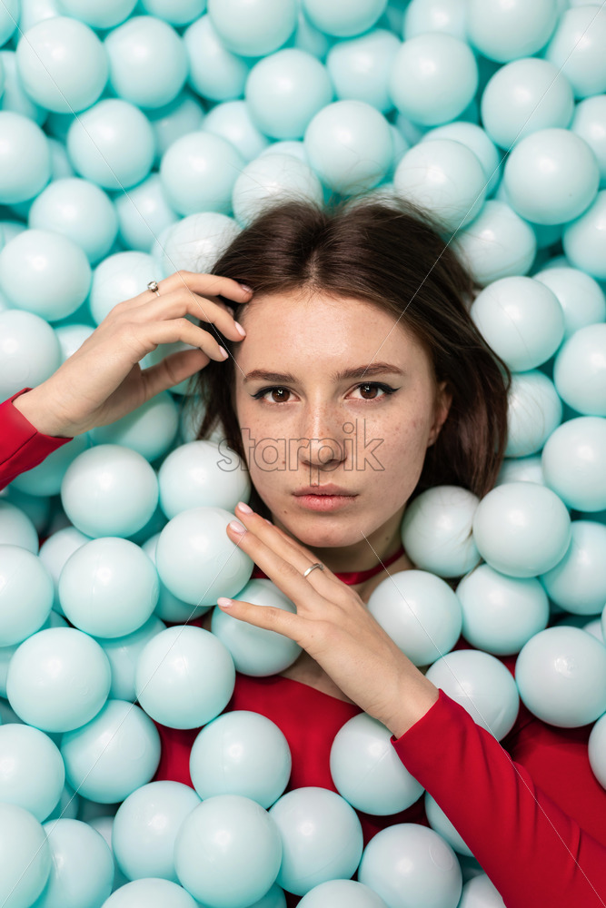 Young woman in a red dress lying and posing in a pile of plastic blue balls in a studio