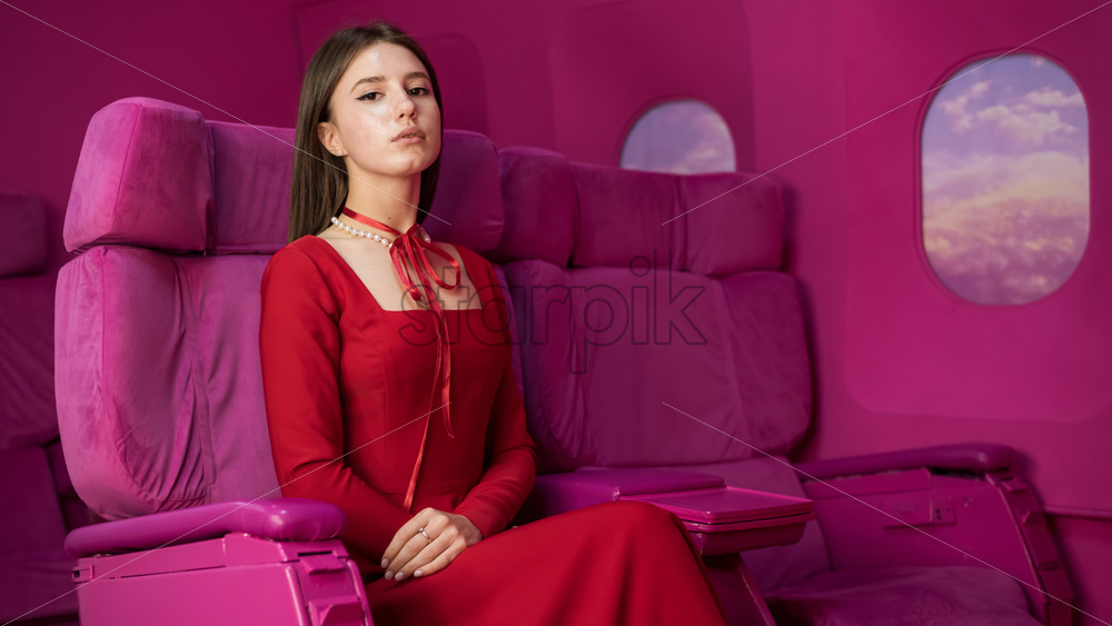 Young woman in red dress posing in a studio with pink airplane seats and walls. Portholes