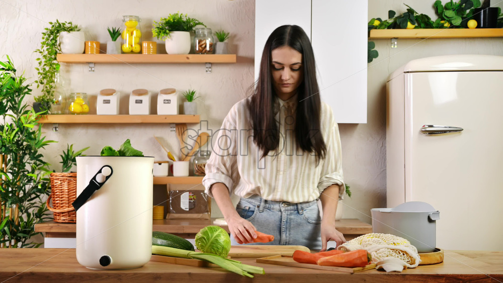 Home » Shop » 1 Video » Video – Young woman recycling vegetables peels in a compost bin. Housewife cooking food and composting organic waste in a bokashi container at home. Ecological and sustainability concept