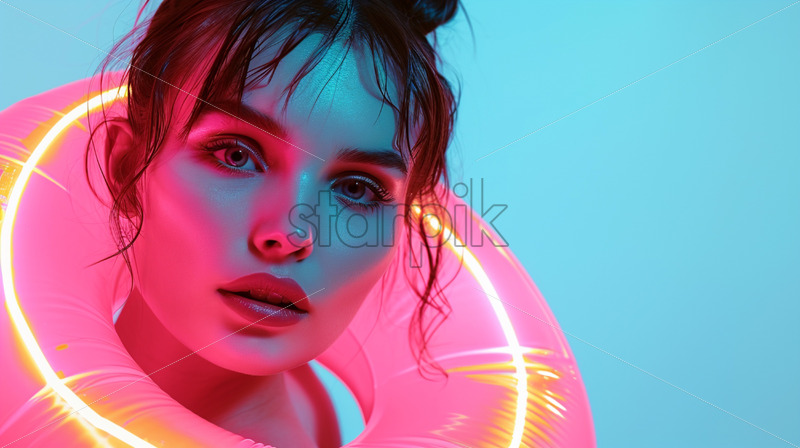 Woman wearing yellow swimming suit and a rounded yellow sunglasses