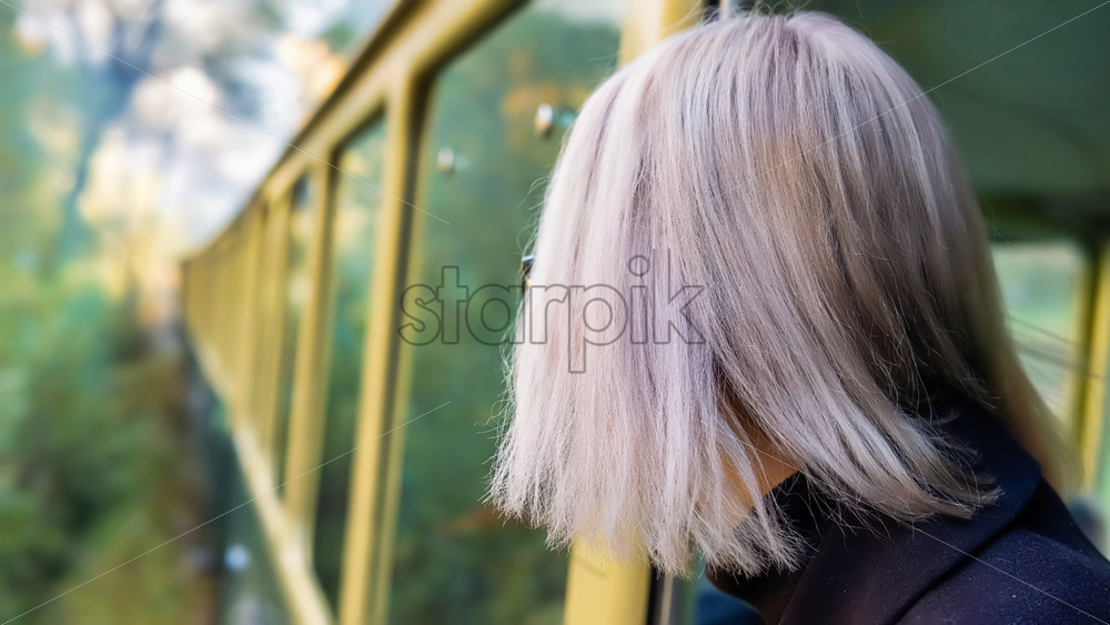 Home » Shop » photo » Young woman with light pink hair in a moving train