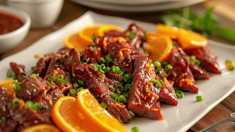 Orange beef on a white serving platter, garnished with orange slices and chopped green onions.